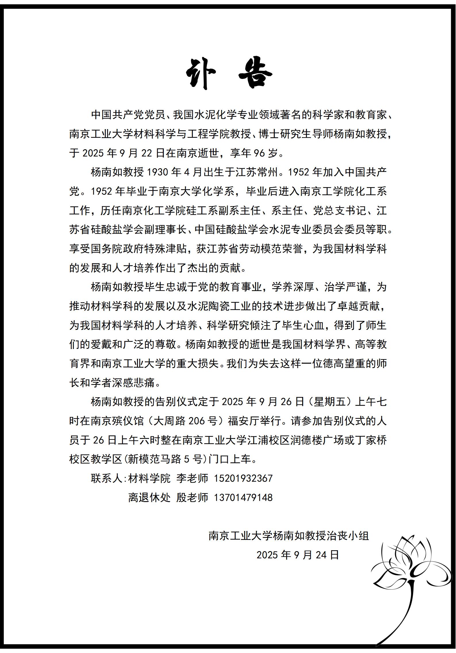 杨南如教授,我国水泥化学专业领域著名的科学家和教育家,1930年4月出生于江苏常州,1952年加入中国共产党。1952年自南京大学化学系毕业后进入南京工学院化工系工作,历任南京化工学院硅工系副系主任、系主任、党总支书记,兼任江苏省硅酸盐学会副理事长、中国硅酸盐学会水泥专业委员会委员等职。2025年9月22日在南京逝世,享年96岁。