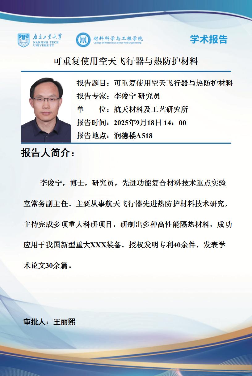 【学术报告】李俊宁研究员:可重复使用空天飞行器与热防护材料