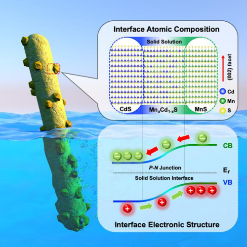 为了改良异质结构筑策略的这一缺陷,我院许仲梓、陆春华教授团队与澳大利亚昆士兰大学王连洲教授团队合作,报道了一种具有MnxCd1-xS固溶界面的新型“孪生结”光催化剂。材料中的梯度固溶体界面构成了缓变型p-n结,为电荷分离和转移提供了有利的内建电场和顺畅的传输通道。该“孪生结”光催化剂无需任何助催化剂,即可获得的高达82.4 μmol h-1的制氢速率,约为原始CdS的48倍,400 nm下的表观量子产率超过10%。该“孪生结”光催化剂的设计理念为新型光催化剂的合理构建提供了新思路和新方法。相关研究成果日前以题为“Design of Twin Junction with Solid Solution Interface for Efficient Photocatalytic H2 Production”刊登于纳米和能源材料领域国际期刊《Nano Energy》,论文第一作者为我院黄亨明博士,通讯作者为我院陆春华、寇佳慧教授与澳大利亚昆士兰大学王连洲教授。相关研究得到了国家自然科学基金、江苏高校优势学科建设工程、江苏先进无机功能复合材料协同创新中心和江苏高校青蓝工程等的资助。